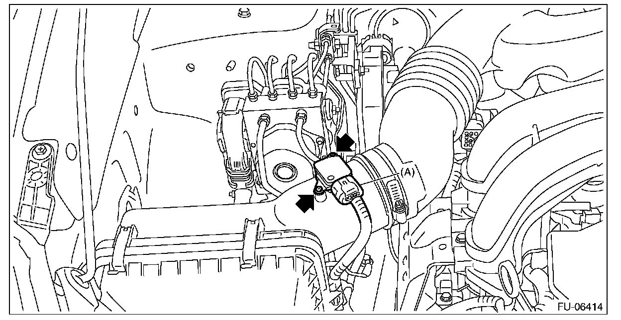 2. Disconnect the connector (A) from the mass air flow and intake air temperature sensor, and remove the mass air flow and intake air temperature sensor.