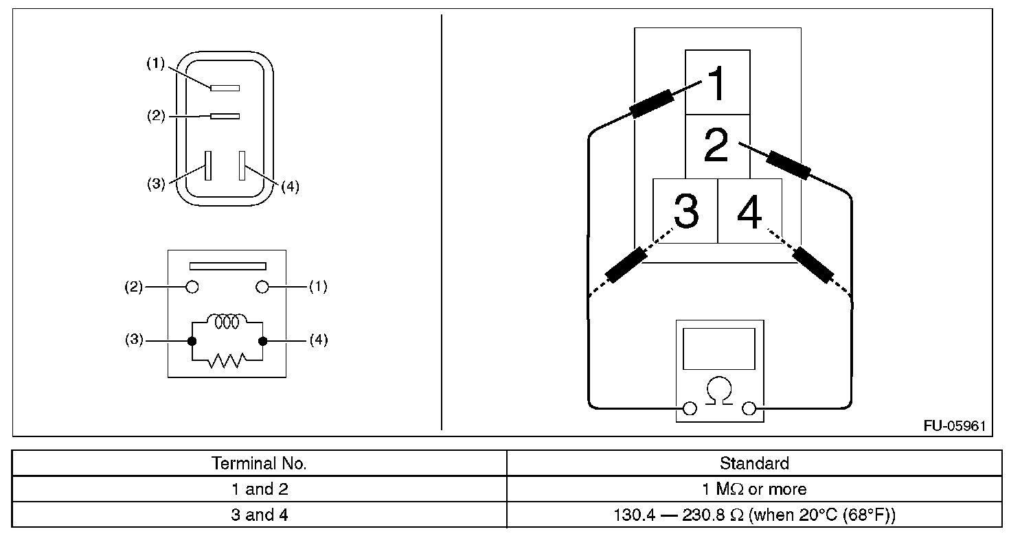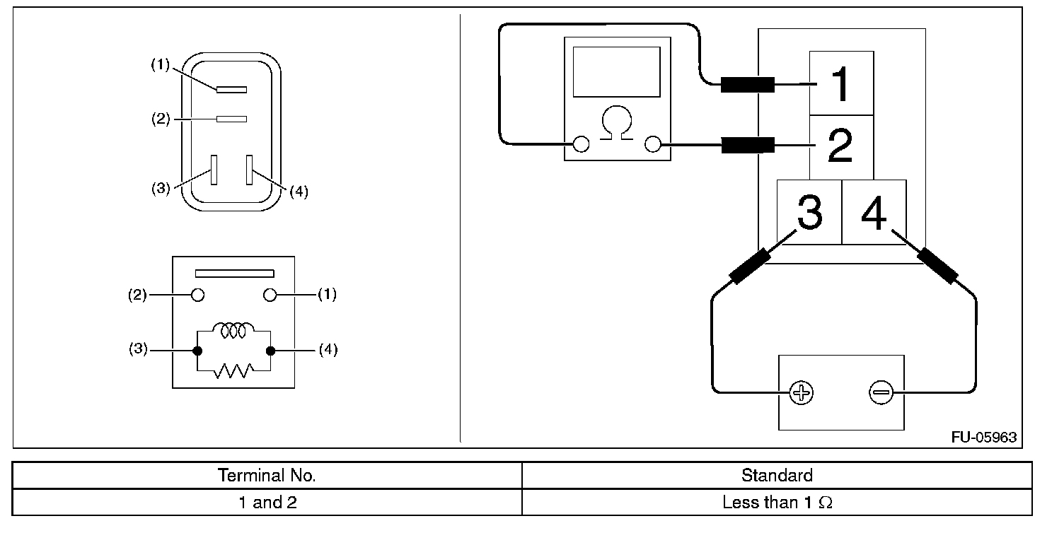 3. Connect battery positive terminal to terminal No. 3 and battery ground terminal to terminal No. 4, and measure the resistance between the main relay terminals.