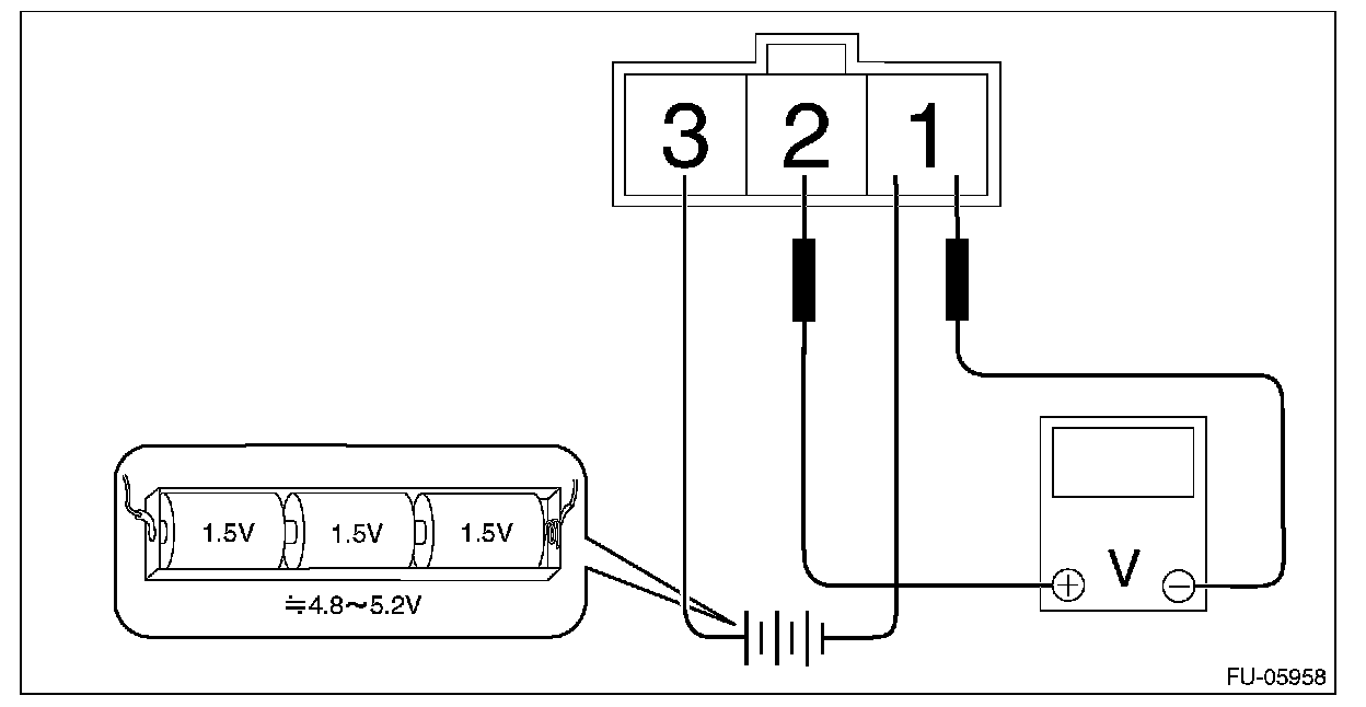 2. Connect dry-cell battery positive terminal to terminal No. 3 and dry-cell battery ground terminal to terminal No. 1, circuit tester positive terminal to terminal No. 2 and the circuit tester negative terminal to terminal No. 1.
