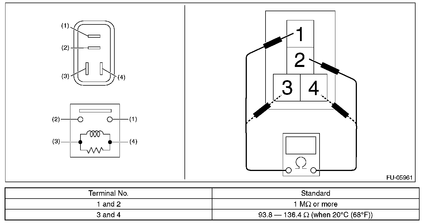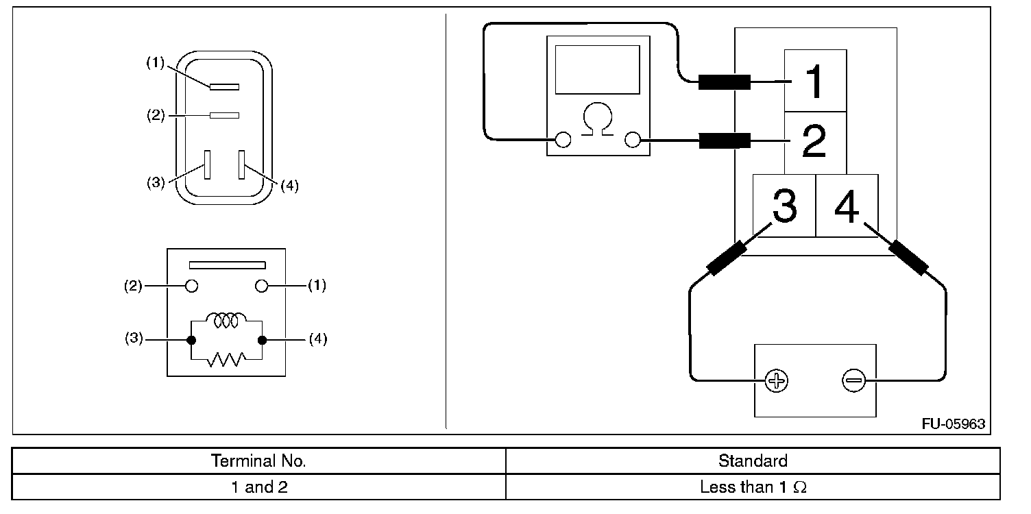 3. Connect battery positive terminal to terminal No. 3 and battery ground terminal to terminal No. 4, and measure the resistance between the electronic throttle control relay terminals.