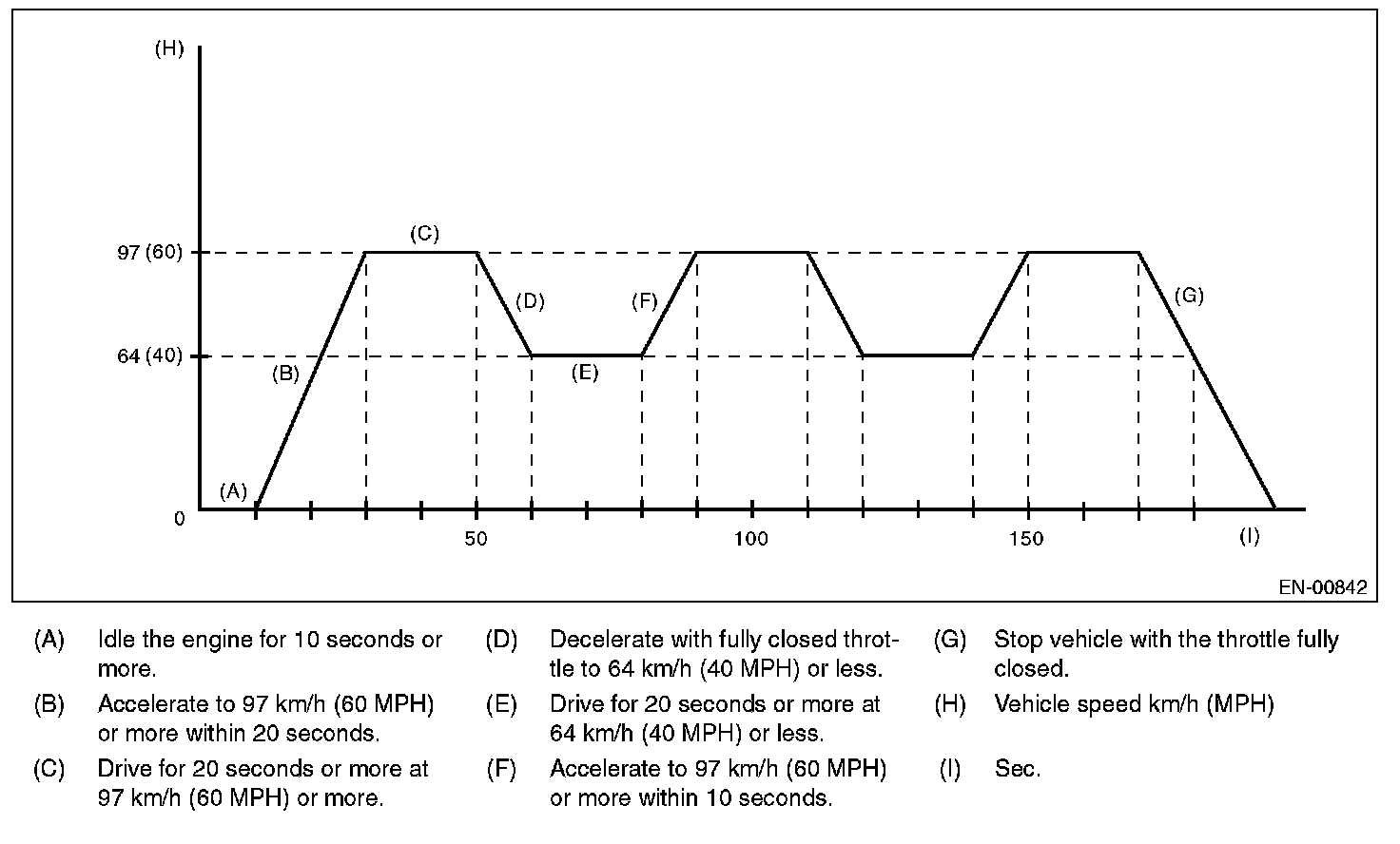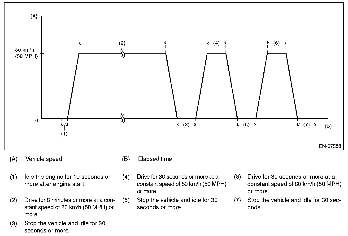 - If it is necessary to perform DRIVE CYCLE I consecutively, drive the vehicle under the following conditions to release accumulated evaporating gas. Performing the DRIVE CYCLE I consecutively without starting the engine causes a large amount of evaporating gas to accumulate in the canister, which hinders an accurate diagnosis.