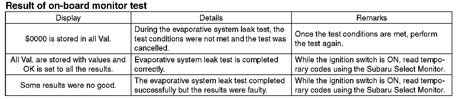 - The Subaru Select Monitor screen does not change after the evaporative system leak test is complete or when the test is aborted by turning off the ignition switch.