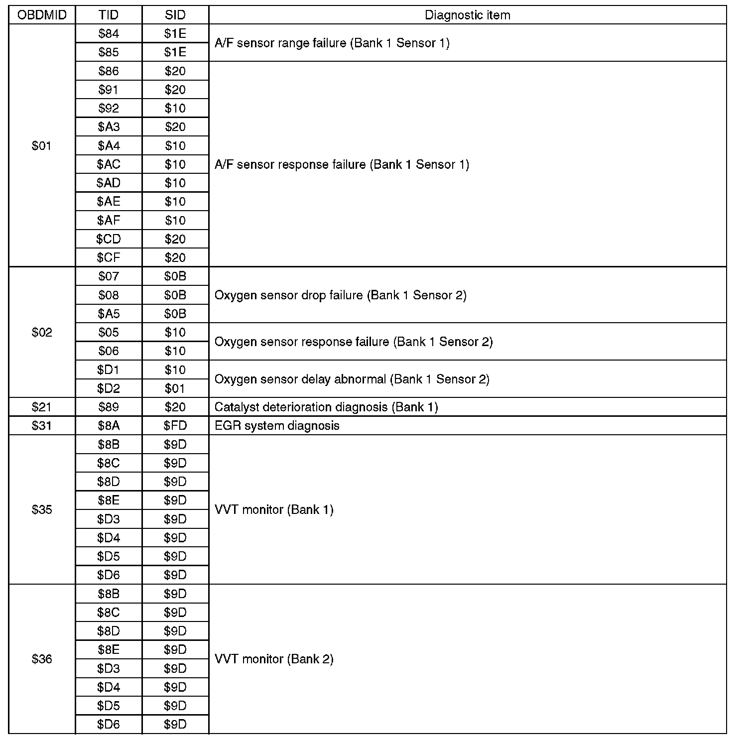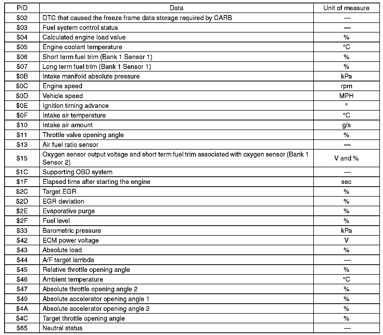 A list of the support data and PID (Parameter Identification) codes are shown in the following table.