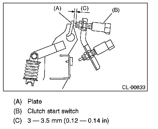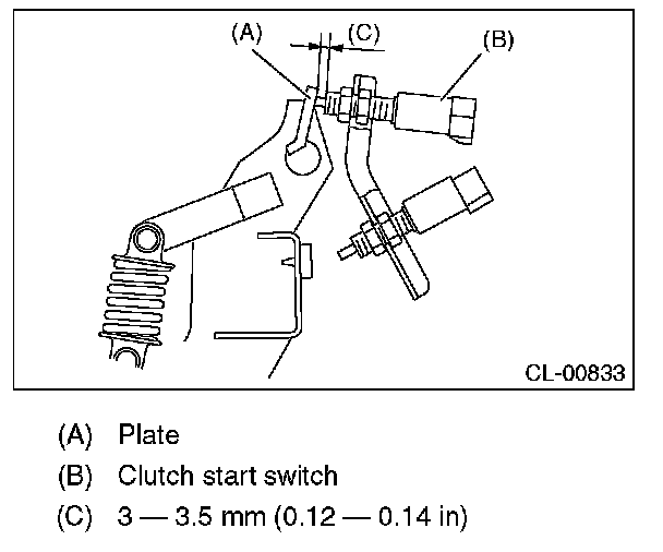 3) Adjust the gap between the clutch pedal plate and the clutch start switch to be 3 - 3.5 mm (0.12 - 0.14 in).