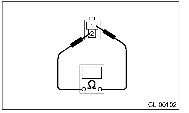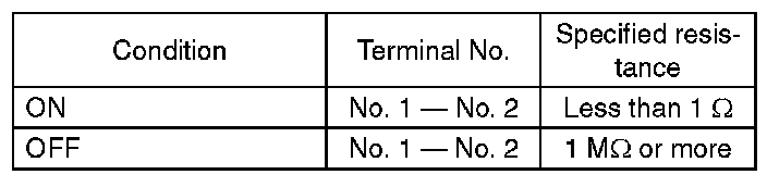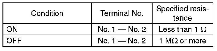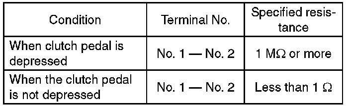 (2) Measure the resistance between terminal 1 and 2 of the switch. If the resistance is not within the specification, inspect the clutch stroke and its installing condition, and check again.