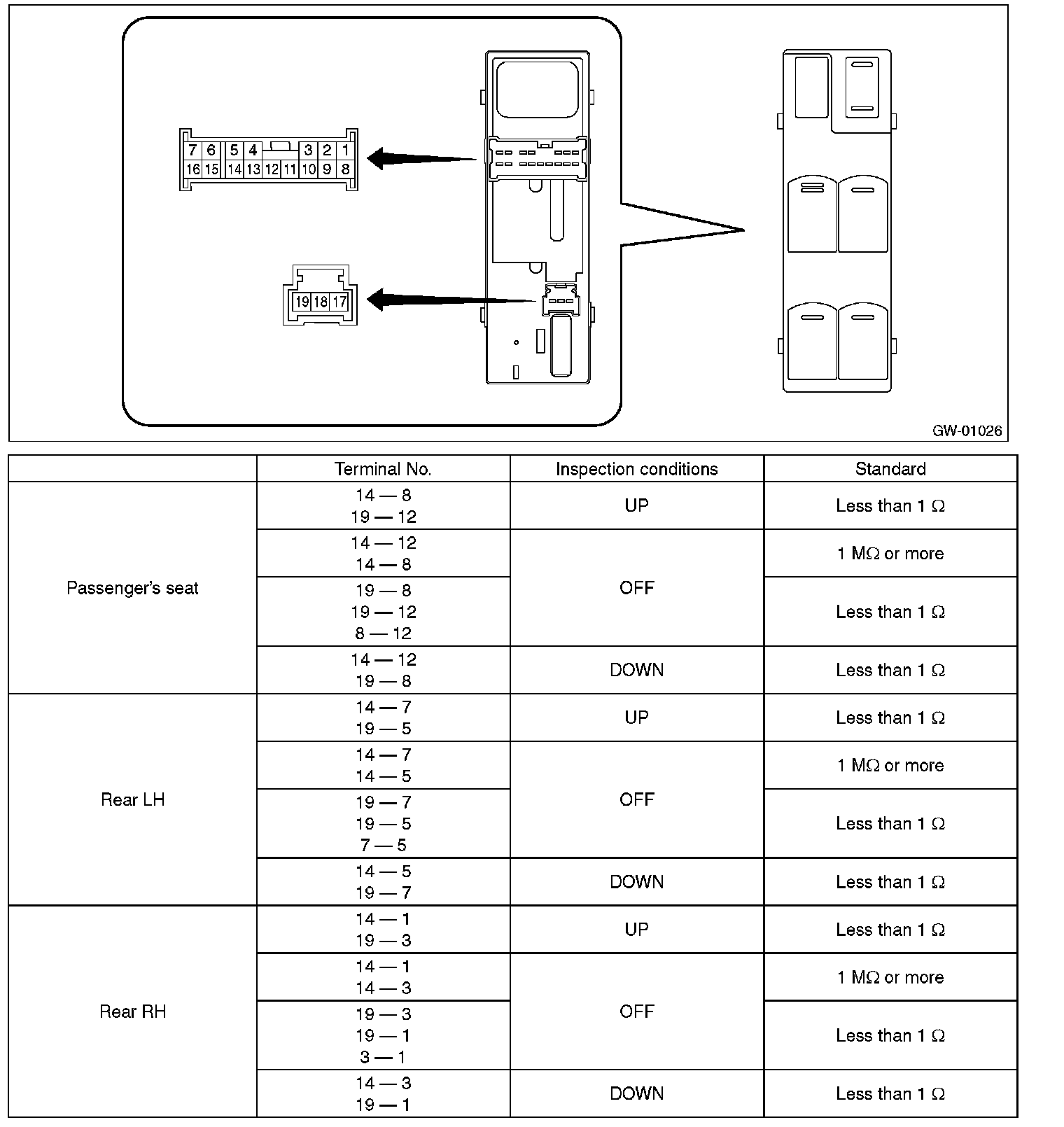 CAUTION: Since the switch - power window main is controlled by CPU, do not check continuity for switch alone with the circuit tester. Performing continuity check with circuit tester can damage the switch - power window main circuit.