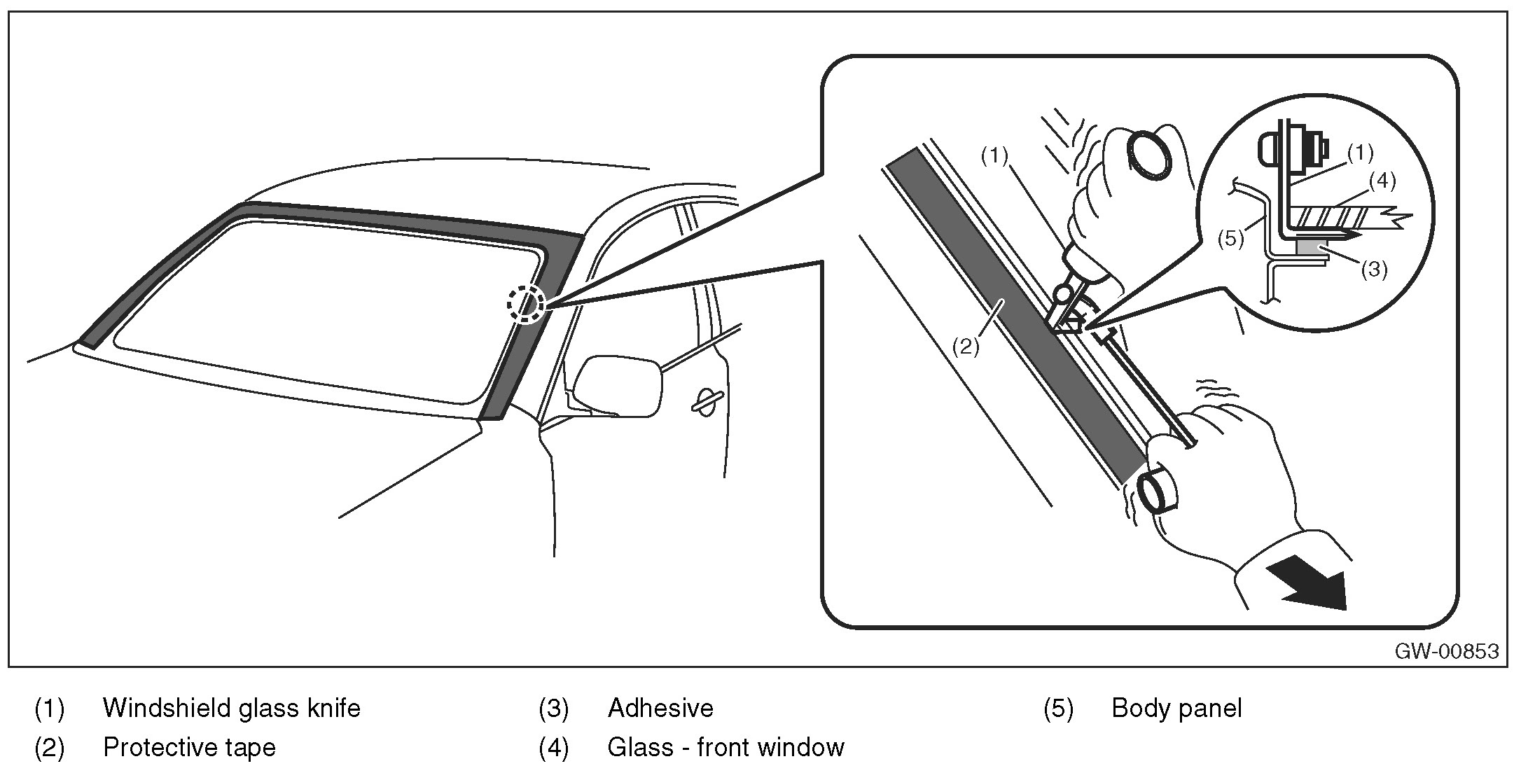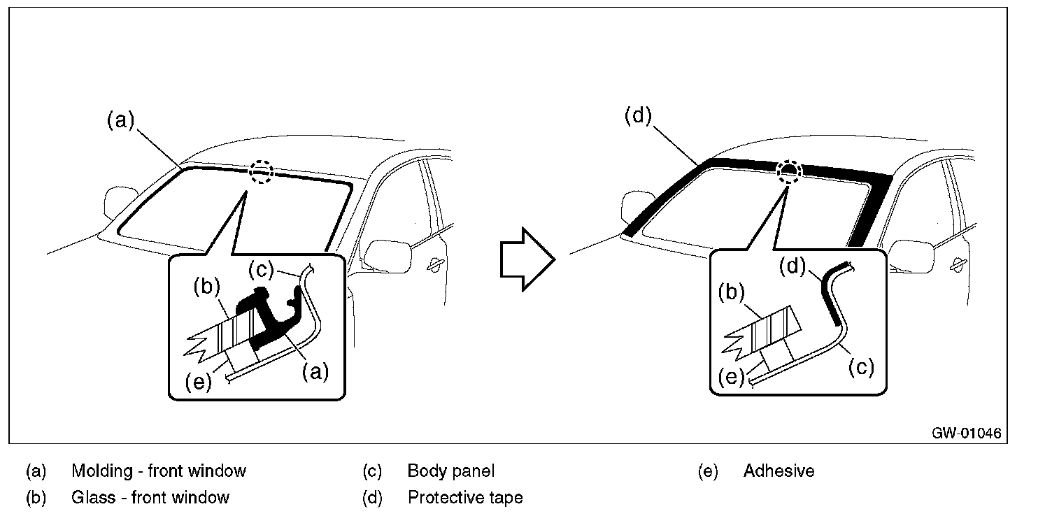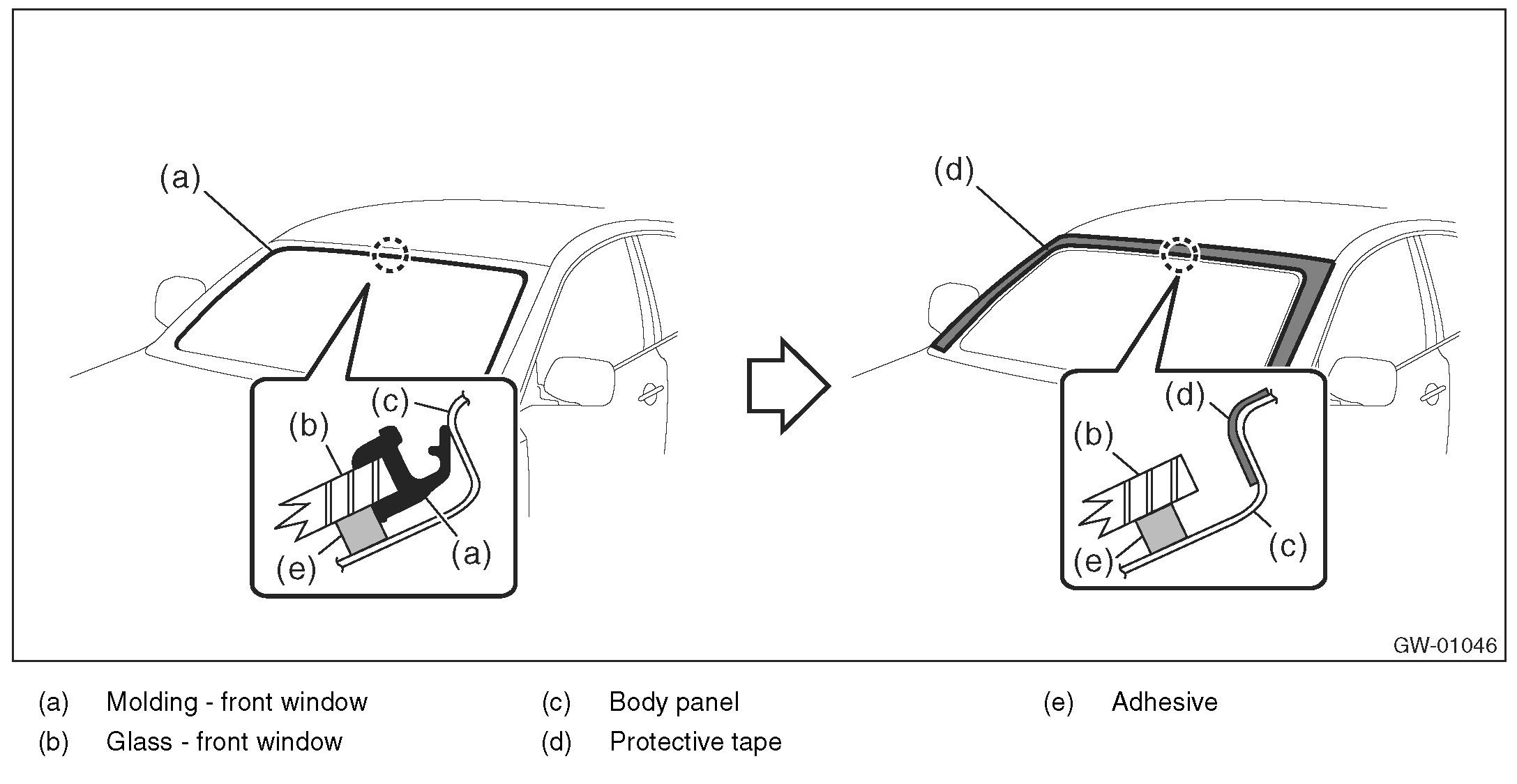 5. Remove the molding - front window from the glass - front window, and attach protective tape on the body side of the circumference of the glass - front window.