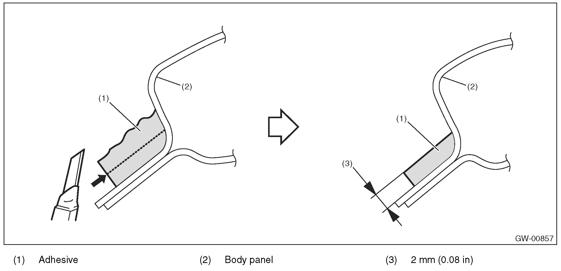 - For minimum drying time and vehicle standing time before driving after bonding, follow instructions or instruction manual from the adhesive manufacturer.