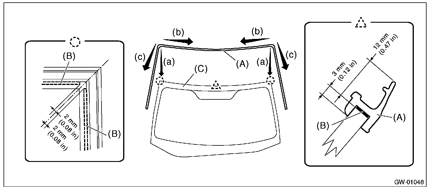 3. Install the molding - front window from both corners of the upper edge toward the lower side (c).