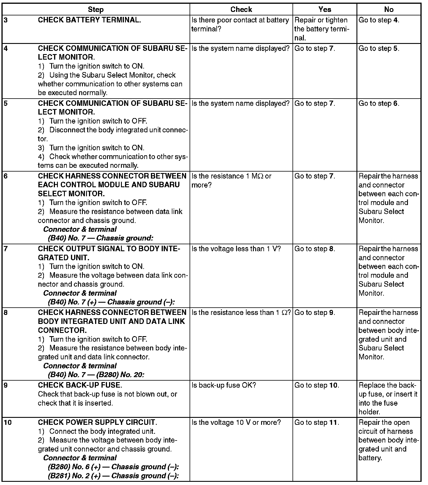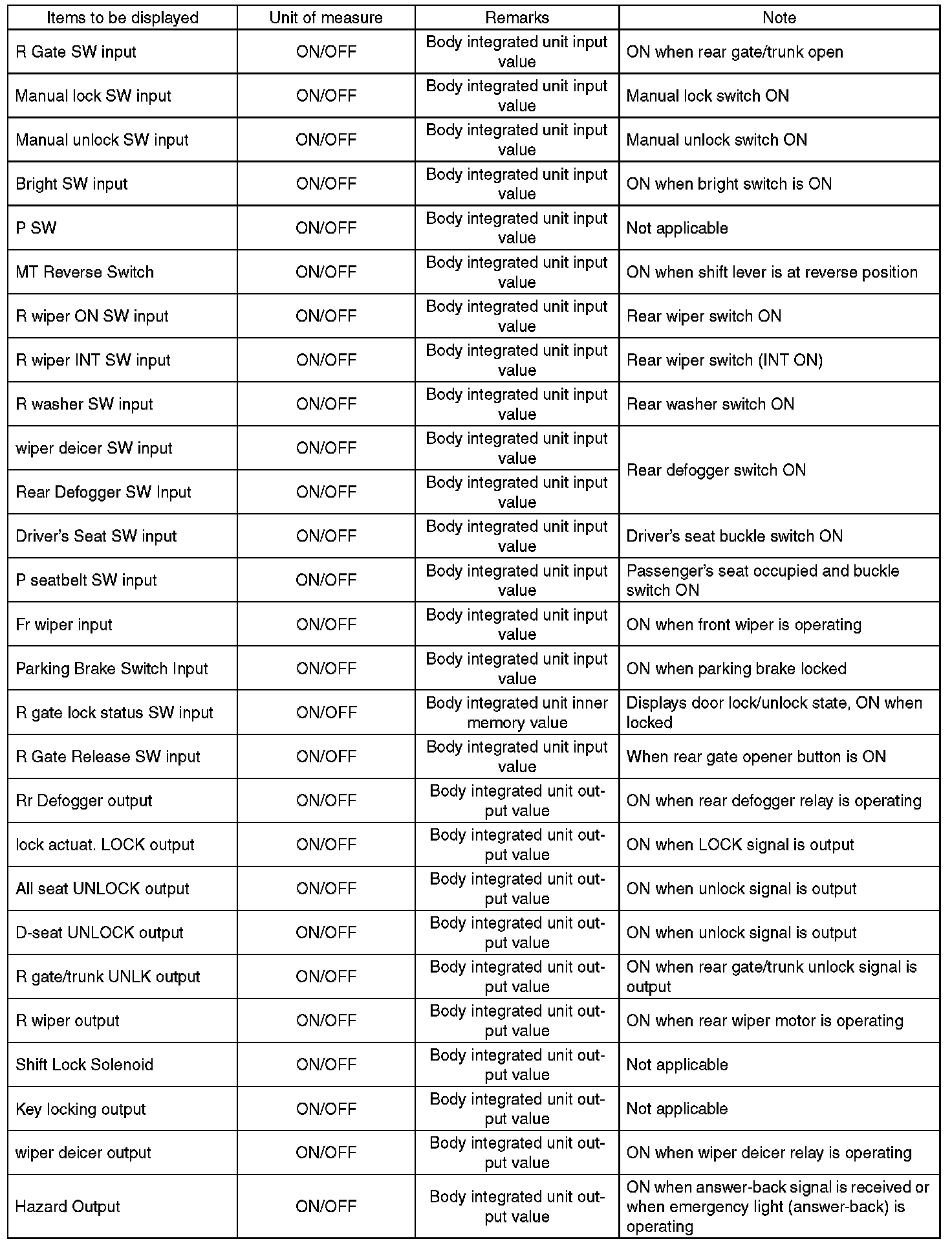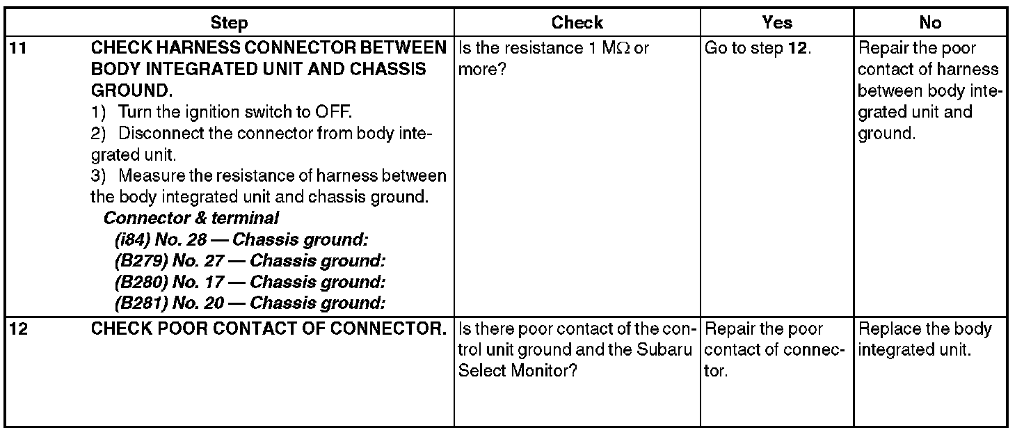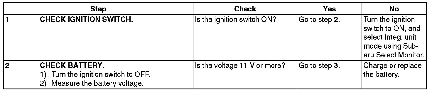 In order to check the body integrated unit function, inspect the body integrated unit and actuator using Subaru Select Monitor without operating switches.