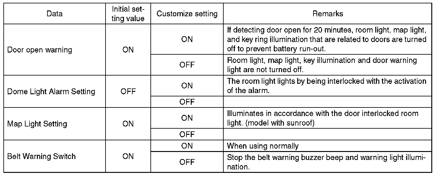 - Each settings have been set. It can be recognized by key ring illumination coming on in concocting with room light and going off with ignition switch turned to ON.