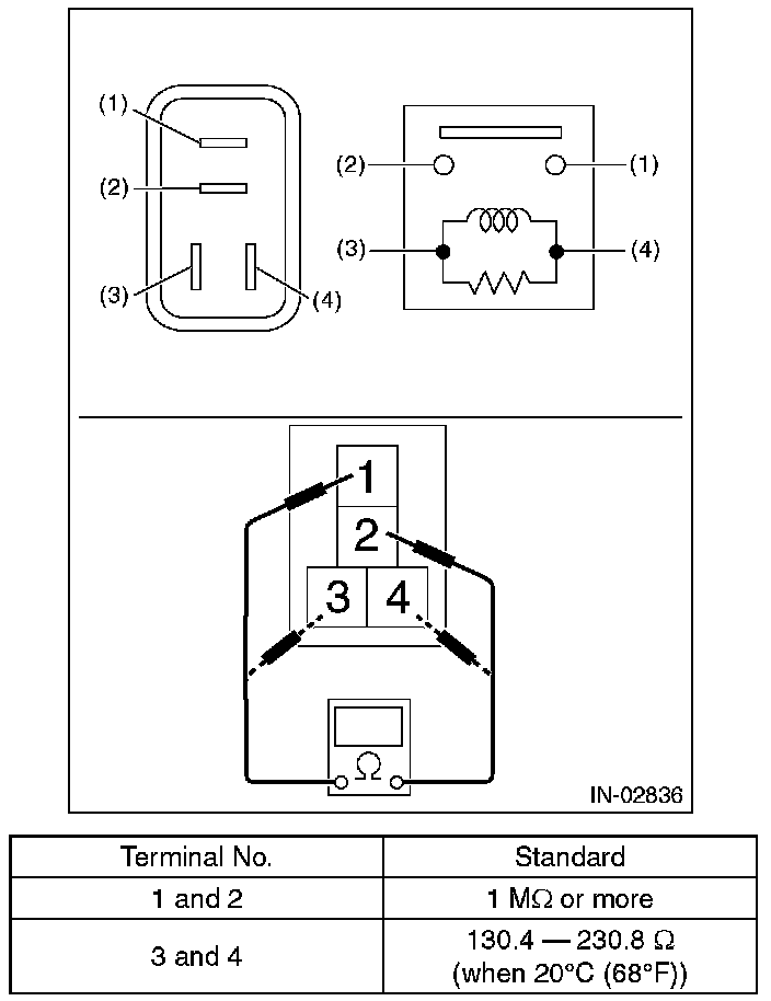 3. Connect battery positive terminal to terminal No. 3 and battery ground terminal to terminal No. 4, and measure the resistance between the main relay terminals.