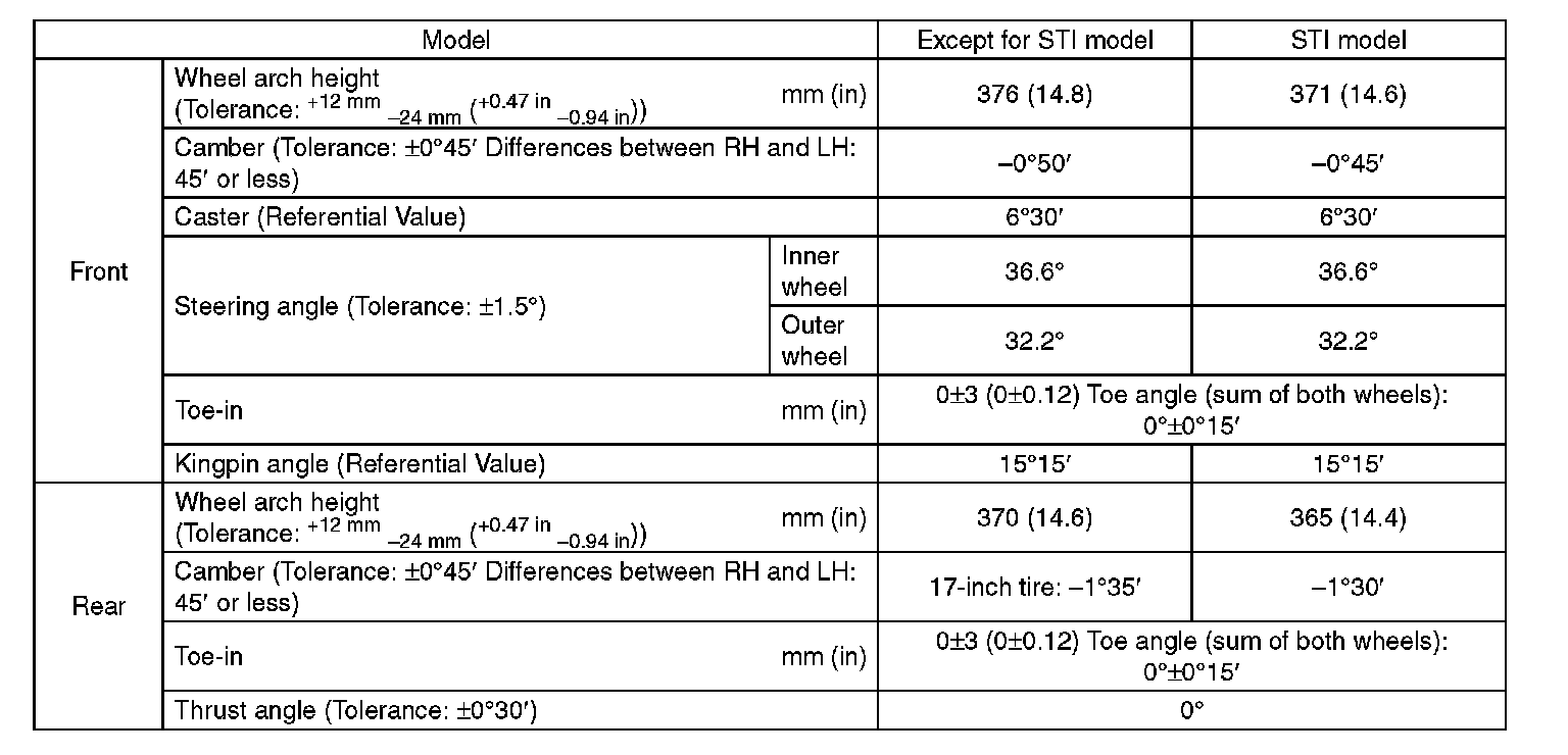 ^ Other items indicated in the specifications is not equipped with adjustment mechanisms. If other items exceed specifications, check the suspension parts and connections for deformation. If defective, replace with new parts.