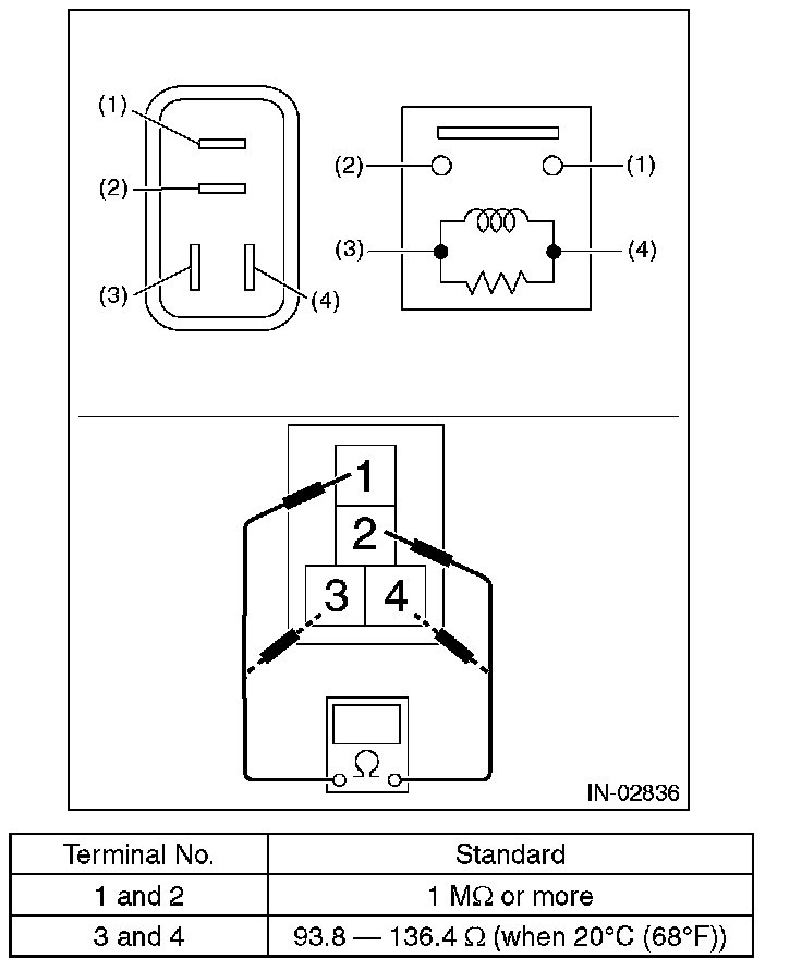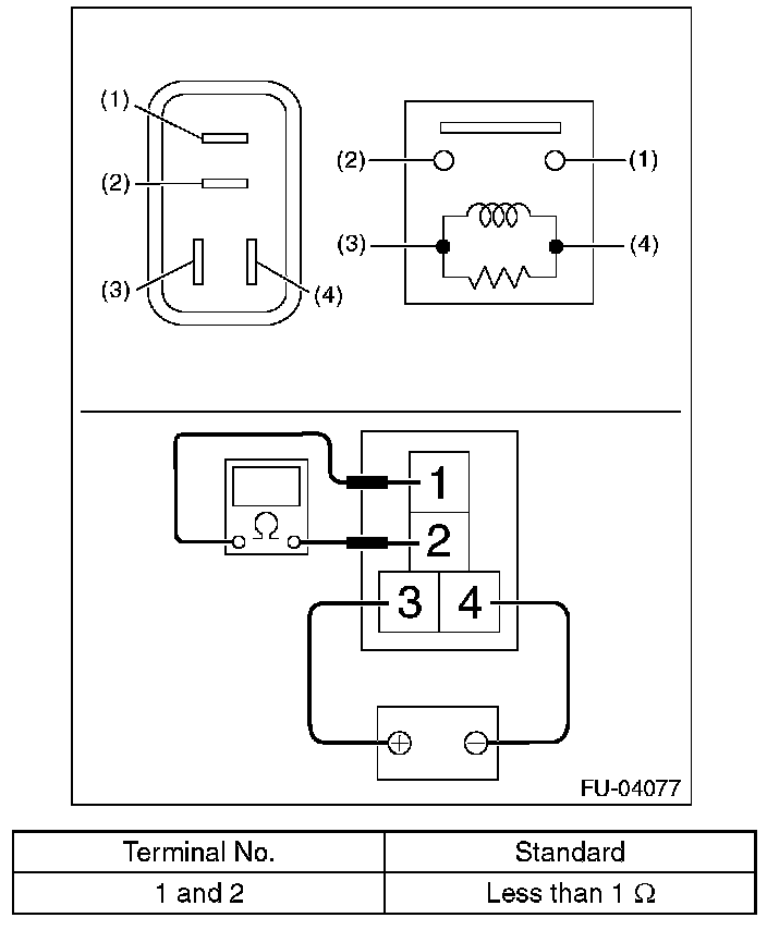 3. Connect battery positive terminal to terminal No. 3 and battery ground terminal to terminal No. 4, and measure the resistance between the electronic throttle control relay terminals.