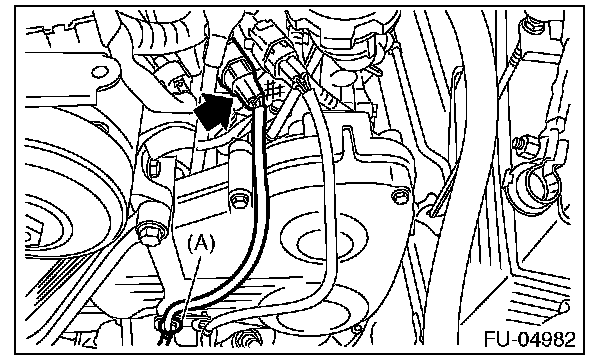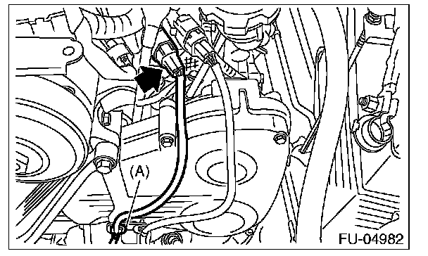 3. Disconnect the connector from the front oxygen (A/F) sensor, and remove the clip (A) holding the front oxygen (A/F) sensor harness.