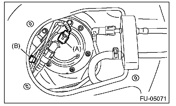 6. Disconnect the connector (A) from fuel sub level sensor, and remove the clip (B) securing the fuel cord from fuel sub level sensor protector.