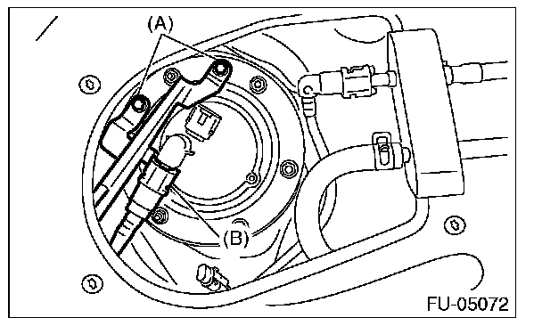 - Align protrusion (B) of the fuel sub level sensor to the cutout in the fuel sub level sensor upper plate.