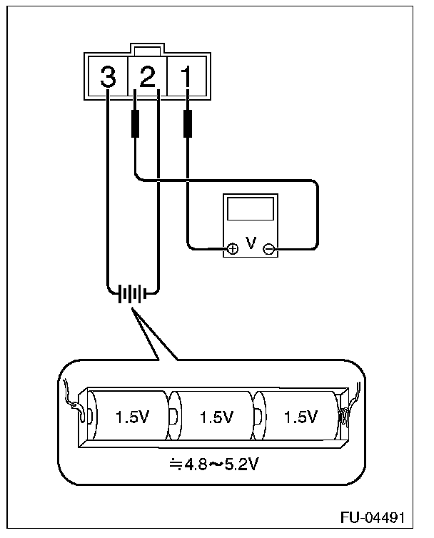 2. Connect dry-cell battery positive terminal to terminal No. 3 and dry-cell battery ground terminal to terminal No. 2, circuit tester ground terminal to terminal No. 2 and the circuit tester positive terminal to terminal No. 1.