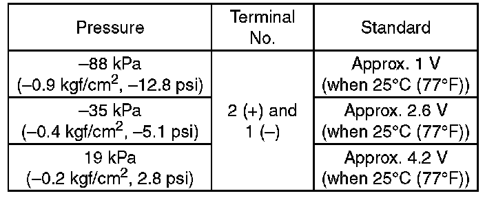 NOTE: When vacuum occurs at the pressure port of manifold absolute pressure sensor, the voltage will drop from the value as in step 3). When positive pressure occurs, on the other hand, the voltage will rise.