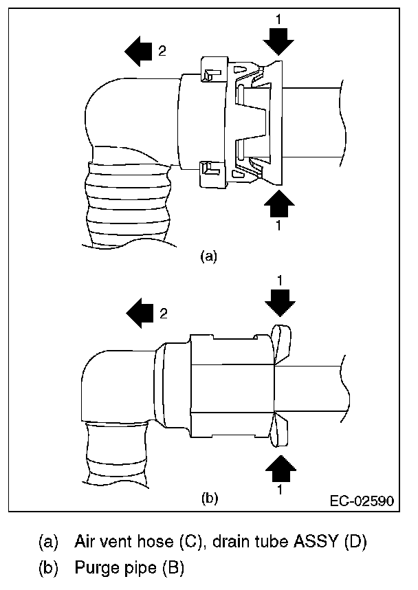 7. Remove the purge hose (A), purge pipe vent hose (C) and drain tube assembly (D).