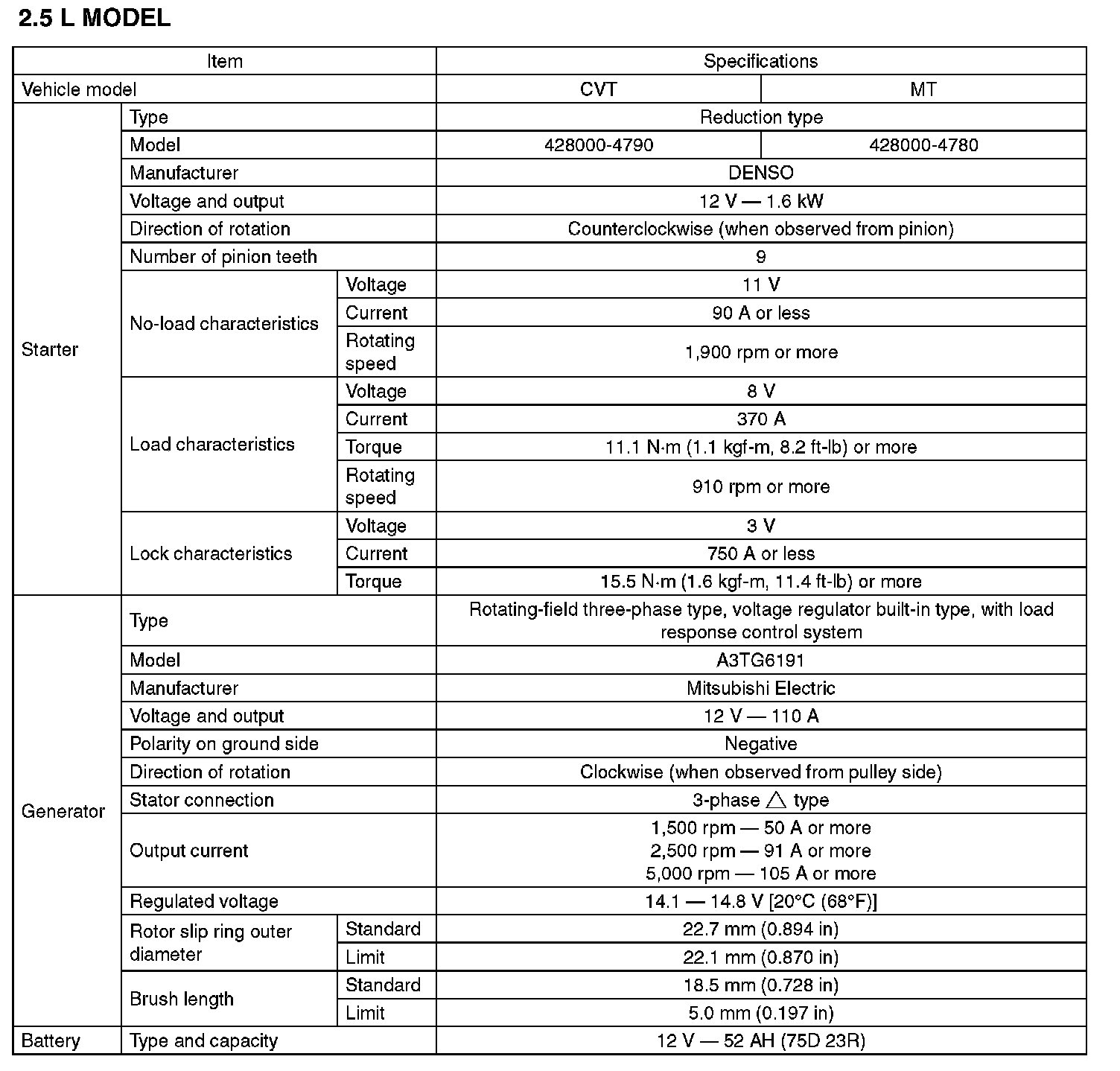 Starting and Charging: Specifications
