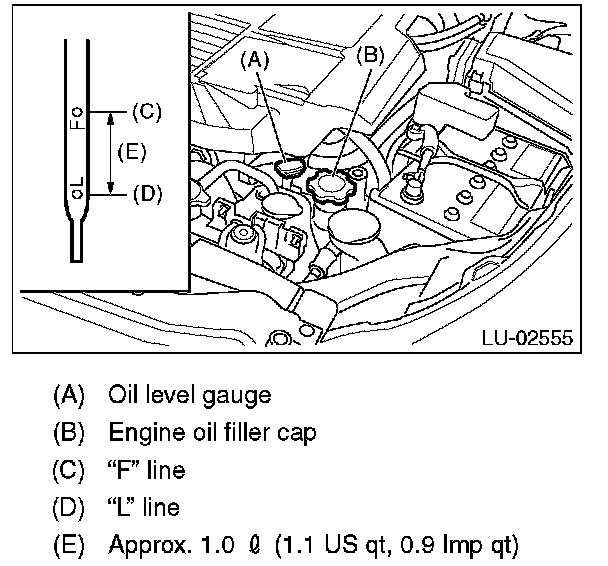 4) Pull out the oil level gauge again, and check the oil level. If the engine oil level is below "L" line, make sure that there is no oil leakage from the engine, then add oil to raise the level up to the "F" line.
