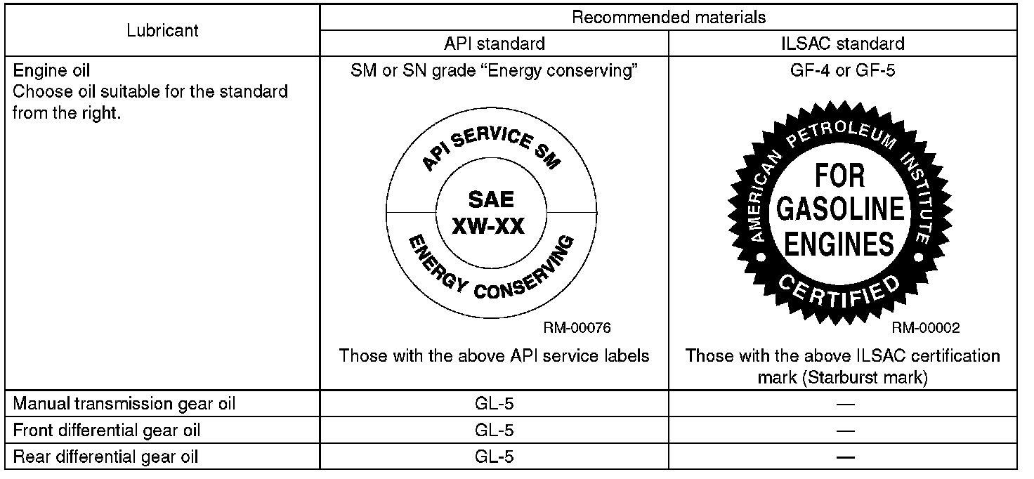 Use the lubricants shown in the table below, or equivalent. See the table below to choose the correct SAE viscosity.