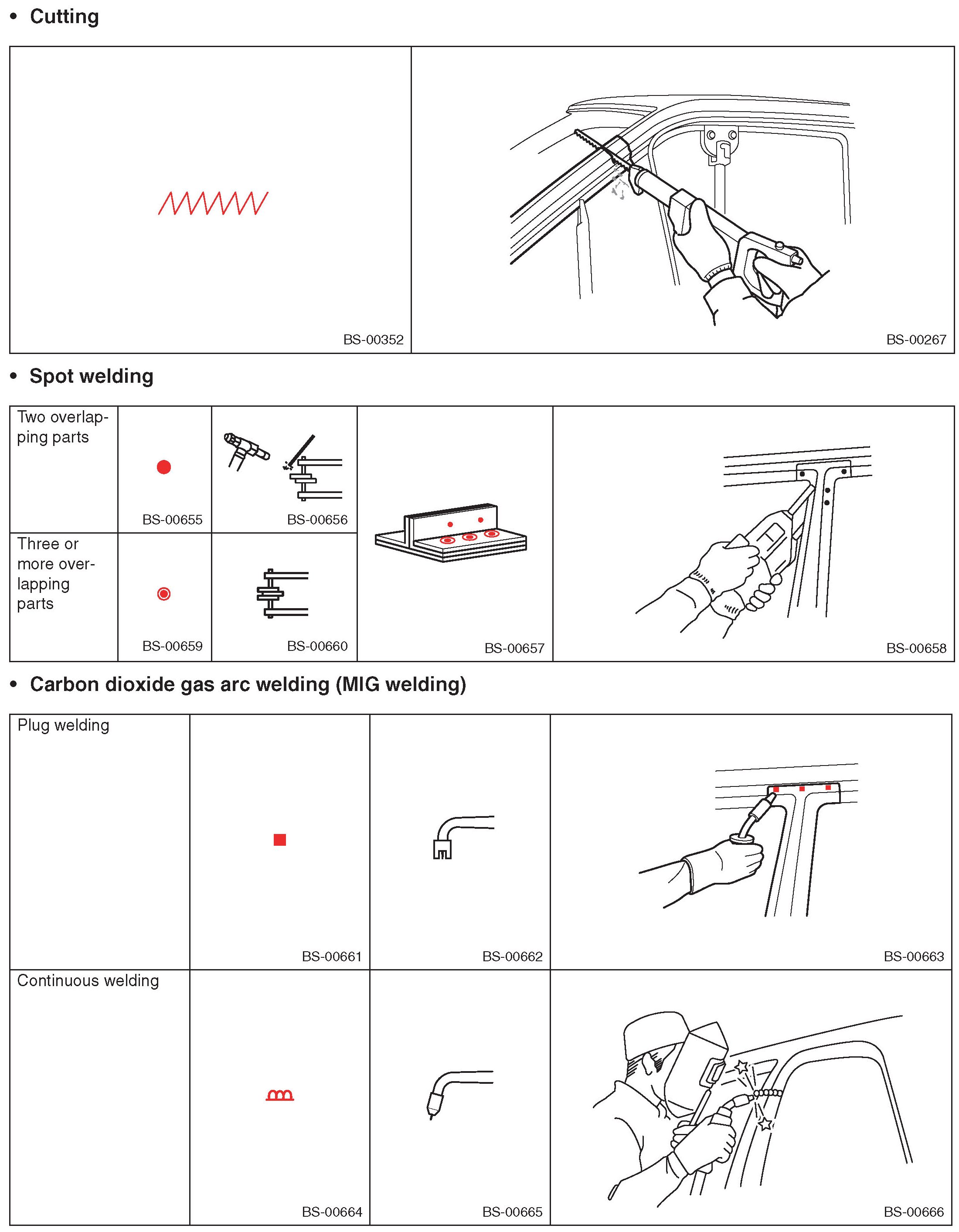 - Symbols and number of points indicate the welding method and the number of welding points. Text in brackets indicates the direction for removal of welded parts, and numbers indicate the number of plates to be drilled in panels of welded parts to be removed.