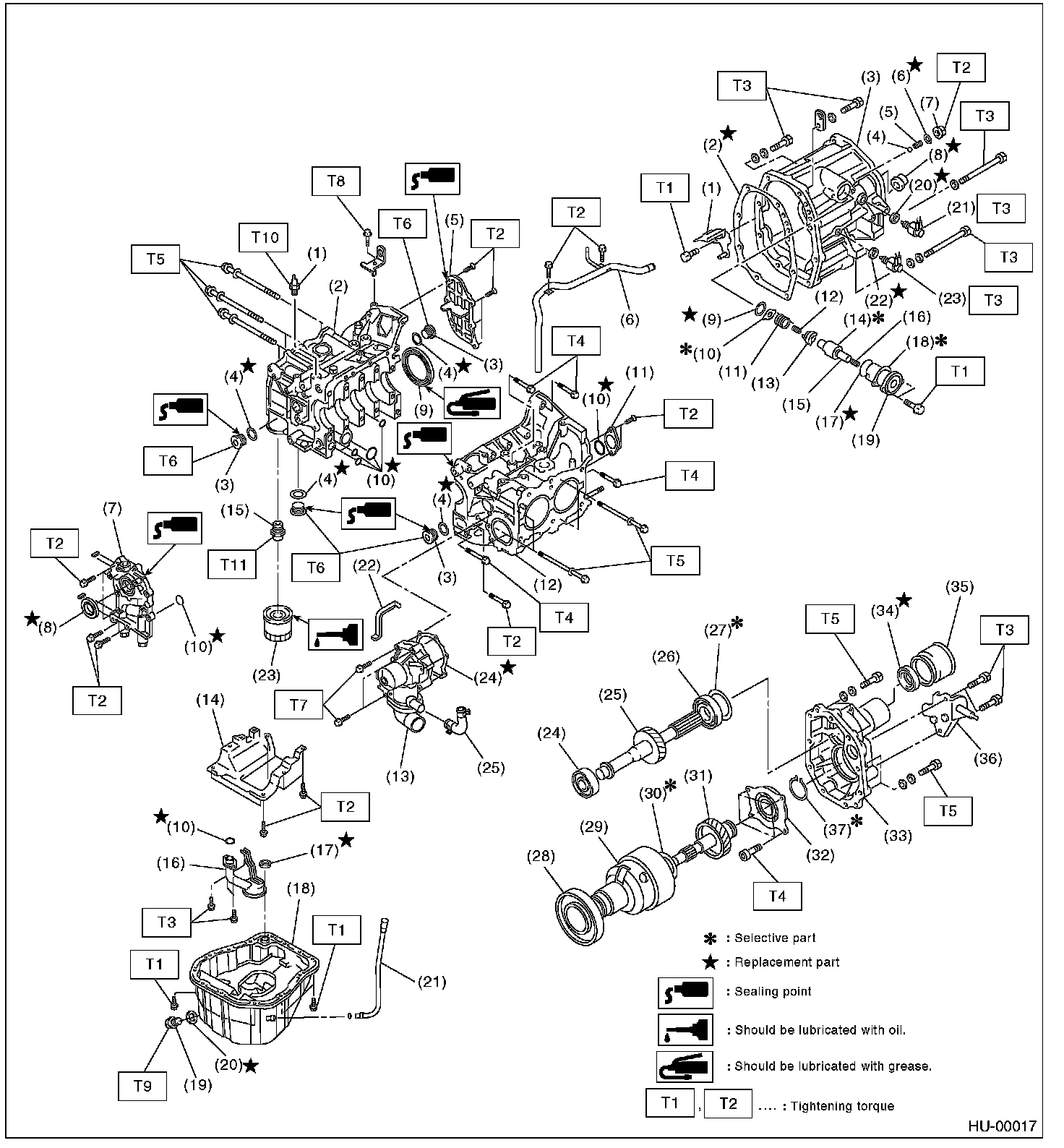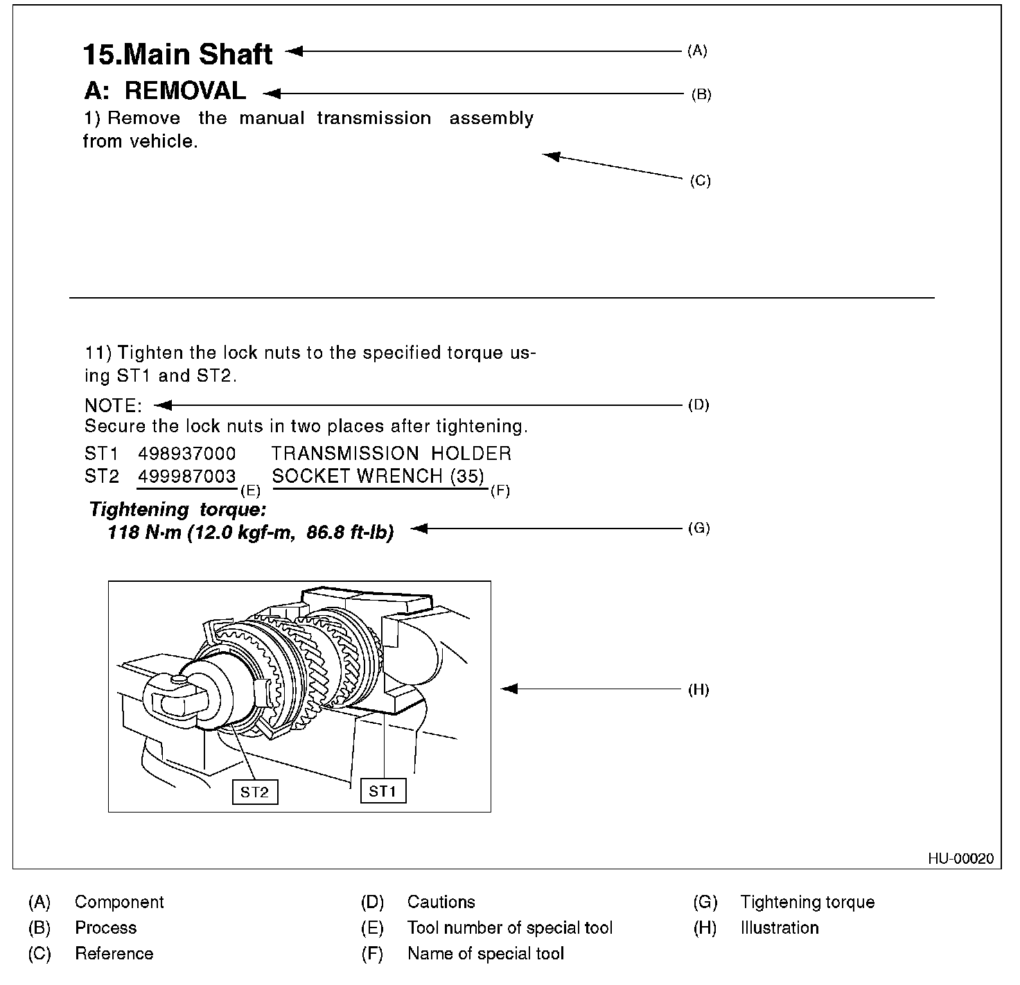 Illustrations are provided for each component. The information necessary for repair work (tightening torque, grease up points, etc.) is described on these illustrations. Information is described using symbol.