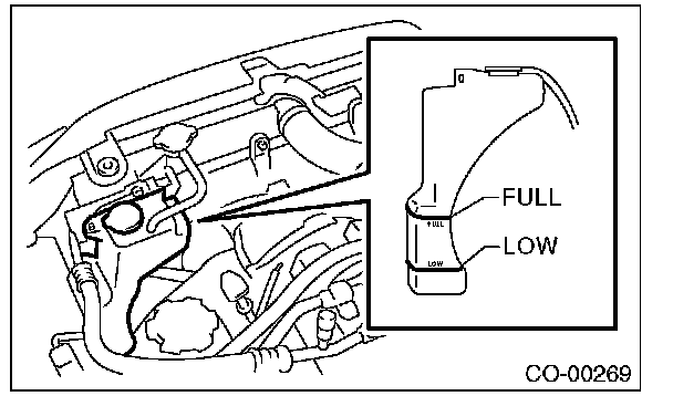 3) Fill engine coolant into the reservoir tank up to "FULL" level.