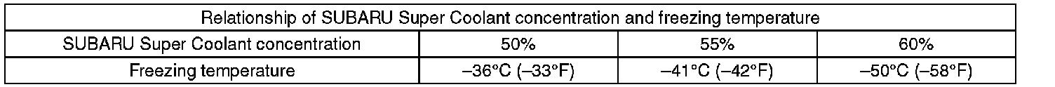 SUBARU Super Coolant concentration must be used from 50 to 60% to assure the best performance of the anti-freeze and anti-rust agents.