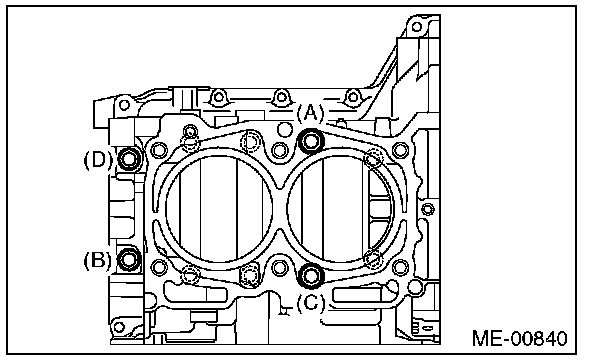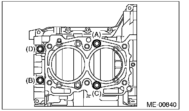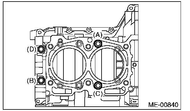7) Tighten the LH side cylinder block connecting bolts (A - D) further in alphabetical order.