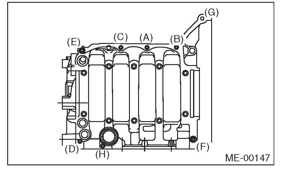 11) Tighten the 8 mm and 6 mm cylinder block connecting bolts on the LH side (A - H) in alphabetical order.