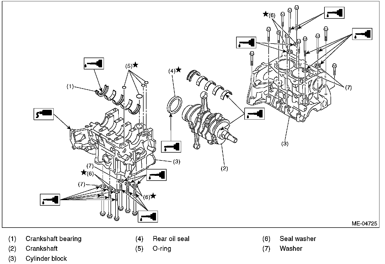 1) Remove oil on the mating surface of cylinder block before installation. Apply a coat of engine oil to the bearing and crankshaft journal.