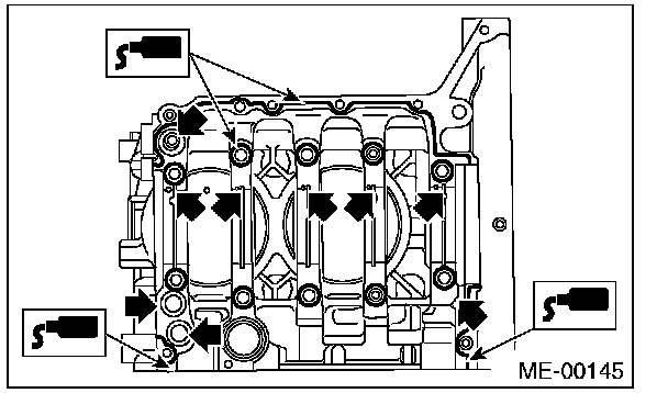 24) Apply liquid gasket to the mating surfaces of cylinder block lower, and install the cylinder block lower.