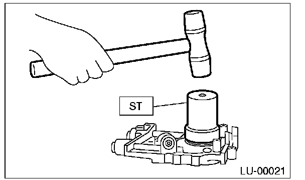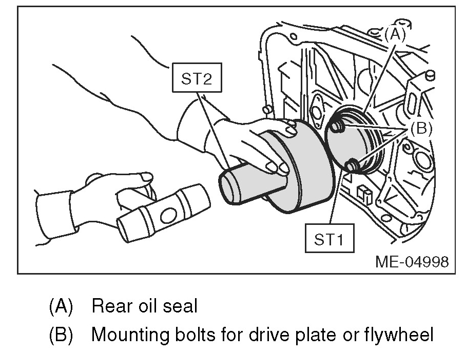 12) Apply a coat of engine oil to the oil seal inner periphery and outer periphery, and install the rear oil seal using ST1 and ST2.