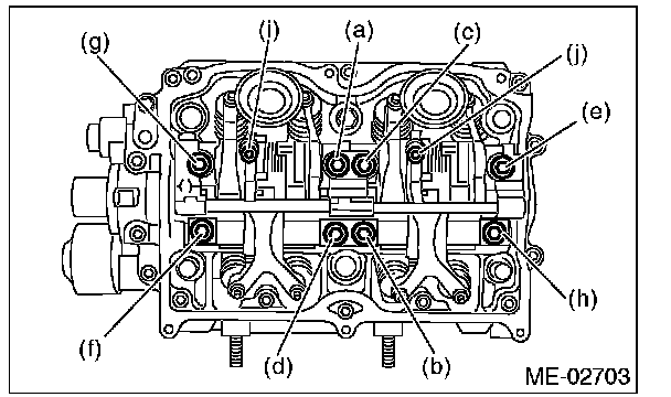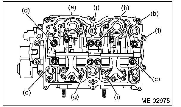 Leave two or three threads of bolts (i) and (j) engaged in order to retain the valve rocker assembly.