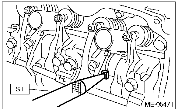 ^ Set the ST in the position shown in the drawing to mount the intake valve rocker assembly.