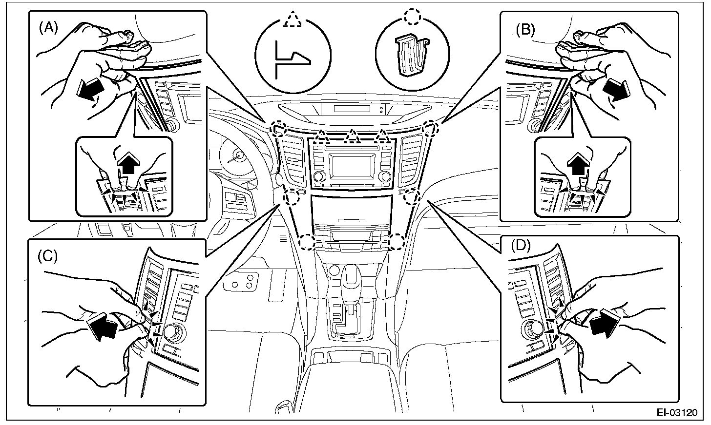 3. Insert a finger into the air vent grille and release the left and right clips at the center of the center panel. (C), (D)