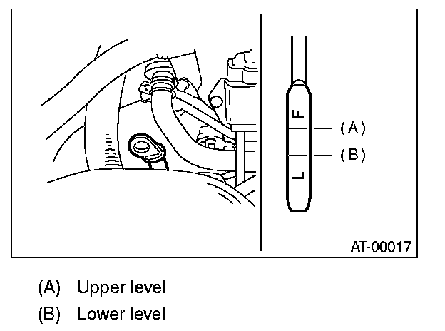 5) Remove the oil level gauge again, and check the level of differential gear oil. If the oil level is below "L" line, add oil to bring the level up to "F" line.
