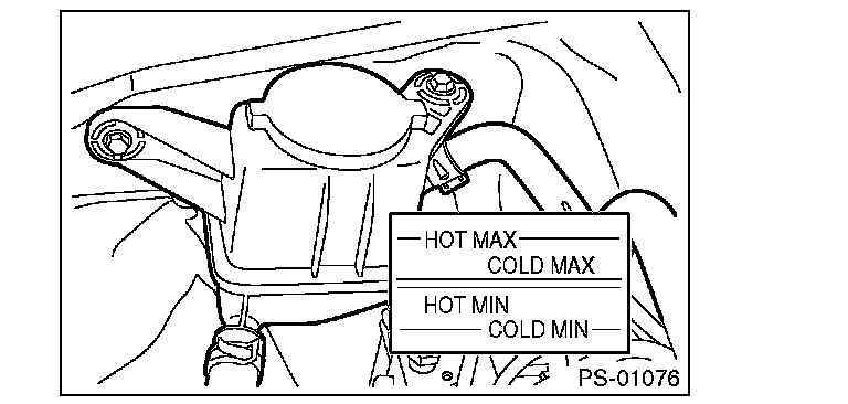 3) Inspect the fluid level of reservoir tank with vehicle on level surface and engine stopped.