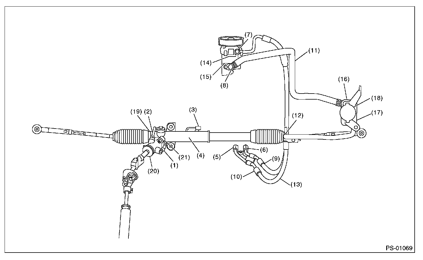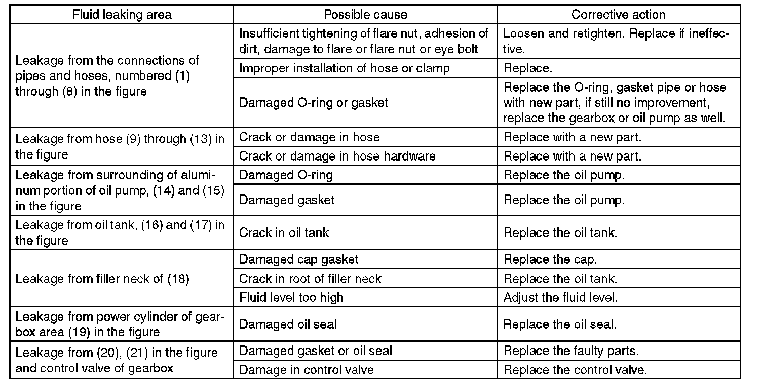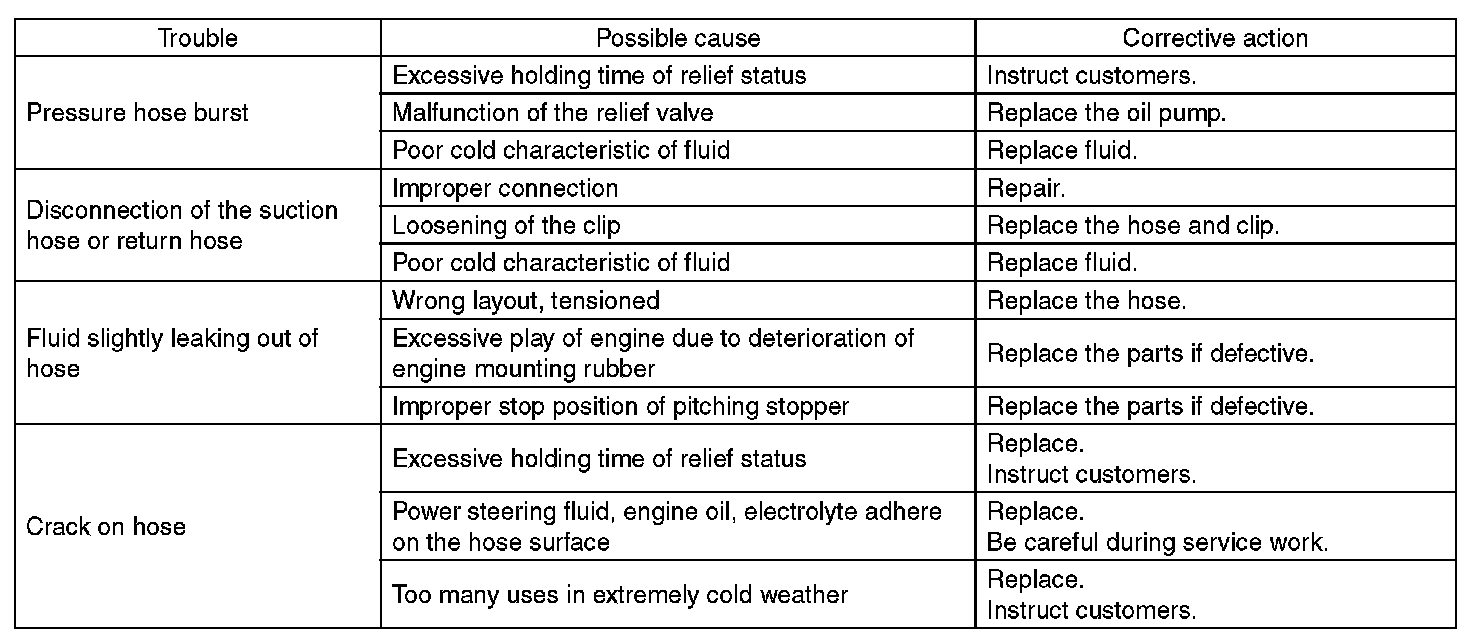Although the surface layer materials of rubber hoses have excellent weathering resistance, heat resistance and resistance for low temperature brittleness, they are likely to be damaged chemically by brake fluid, battery electrolyte, engine oil and automatic transmission fluid and their service lives are to be very shortened. Wipe off hoses immediately if any of these come into contact with the hoses. Since resistances for heat or low temperature brittleness are gradually declining according to time accumulation of hot or cold conditions for the hoses and their service lives are shortening accordingly, it is necessary to perform careful inspection frequently when the vehicle is used in hot weather areas, cold weather areas and a driving condition in which many steering operations are required in short time.