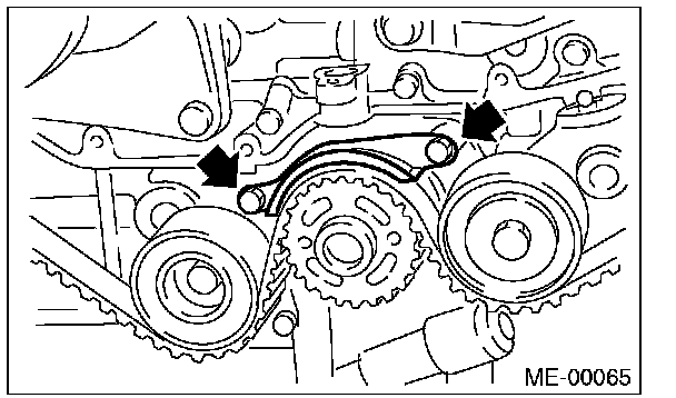 (2) Using white paint, put an alignment mark or an arrow mark on timing belts in relation to the crank sprocket and cam sprockets.