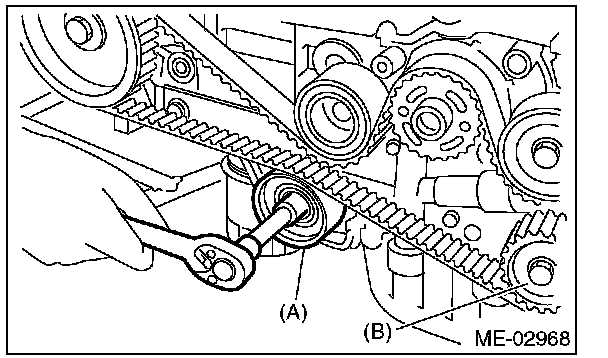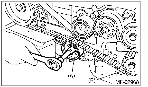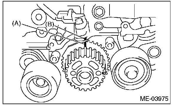4) While aligning the alignment mark (B) on timing belt with the mark (A) on sprockets, position the timing belt properly.