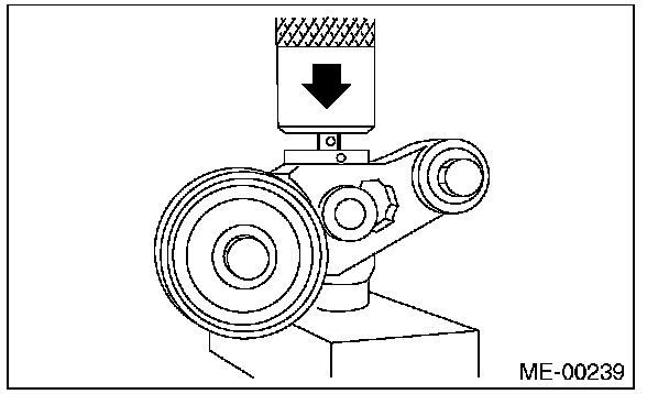 2) Check the belt tension pulley for smooth rotation. Replace the automatic belt tension adjuster assembly with a new part if abnormal noise or excessive play occurs.