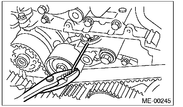 7) After ensuring the marks on timing belt and camshaft sprockets are aligned, remove the stopper pin from belt tension adjuster.