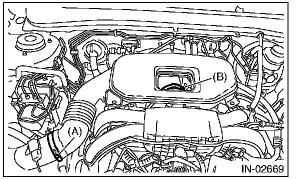 4) Loosen the clamp (B) which connects the air intake boot assembly and throttle body.