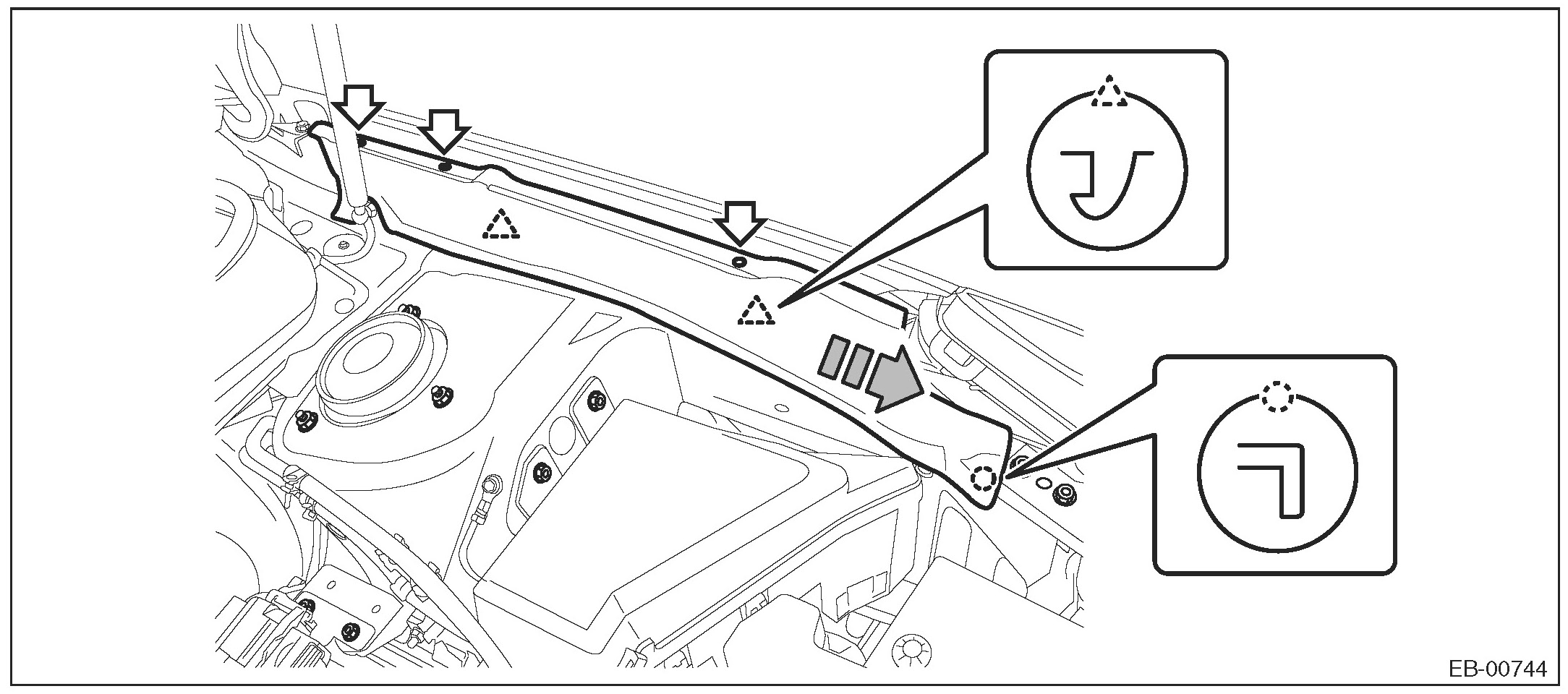 b. Release the claws of the fender cover assembly UPR by pulling it forward and remove the fender cover.