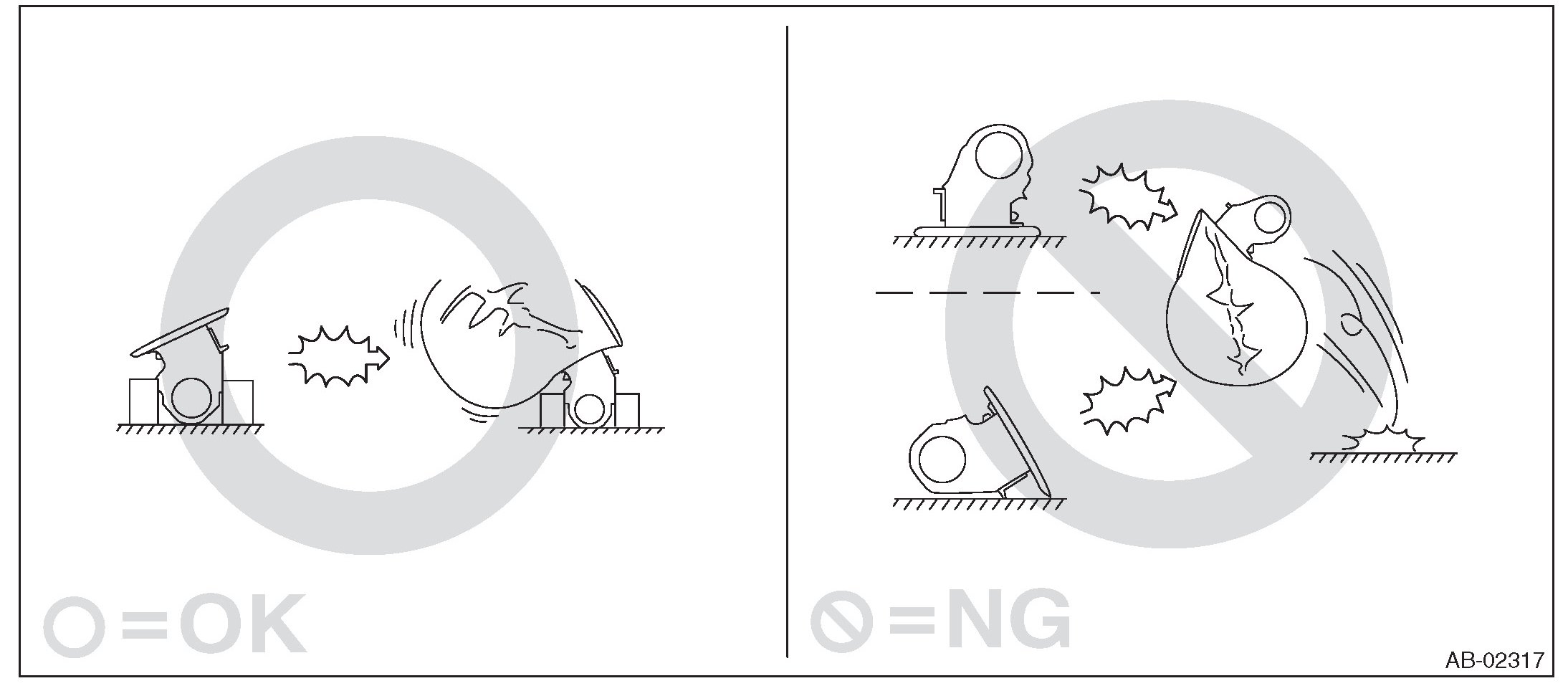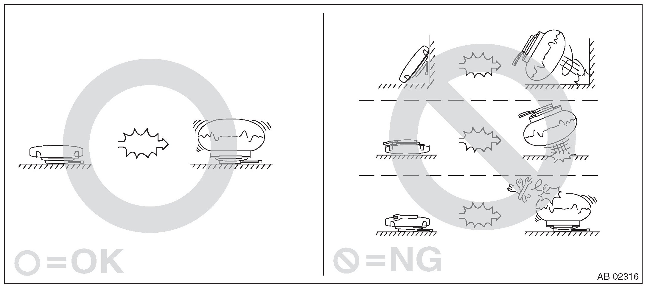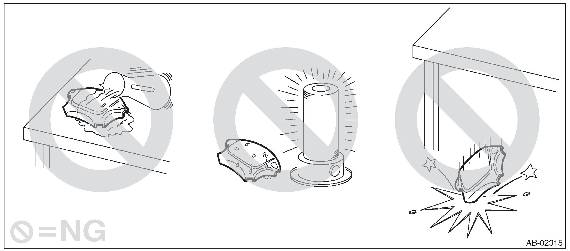 - Do not drop any airbag component, store them under high temperature of 85 °C (185 °F) or more, or let water, oil or grease get on them; the internal parts may be damaged or the reliability may be greatly lowered.
