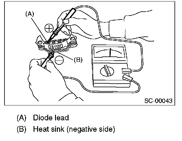 1. Check for continuity between the diode lead and positive side heat sink. If resistance is 1 Ohm or more only in the direction from the diode lead to the heat sink, replace the rectifier.